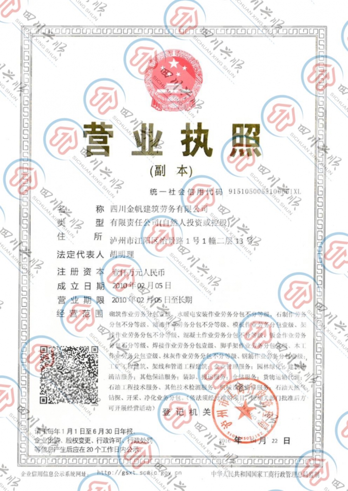 版權(quán)所有:四川興順勞務(wù)代理有限公司 四川金帆建筑勞務(wù)有限公司 公司地址:四川省瀘州市江陽區(qū)怡景路1號1幢二層13號